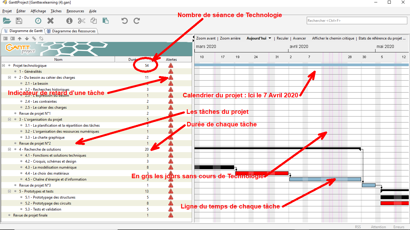 Le fichier GanttProject à paramétrer pour votre projet (ICI) vous devrez le renommer pour votre projet. Votre professeur à créé le fichier complet avec l'ensemble des tâches sur l'année scolaire 2019/2020.