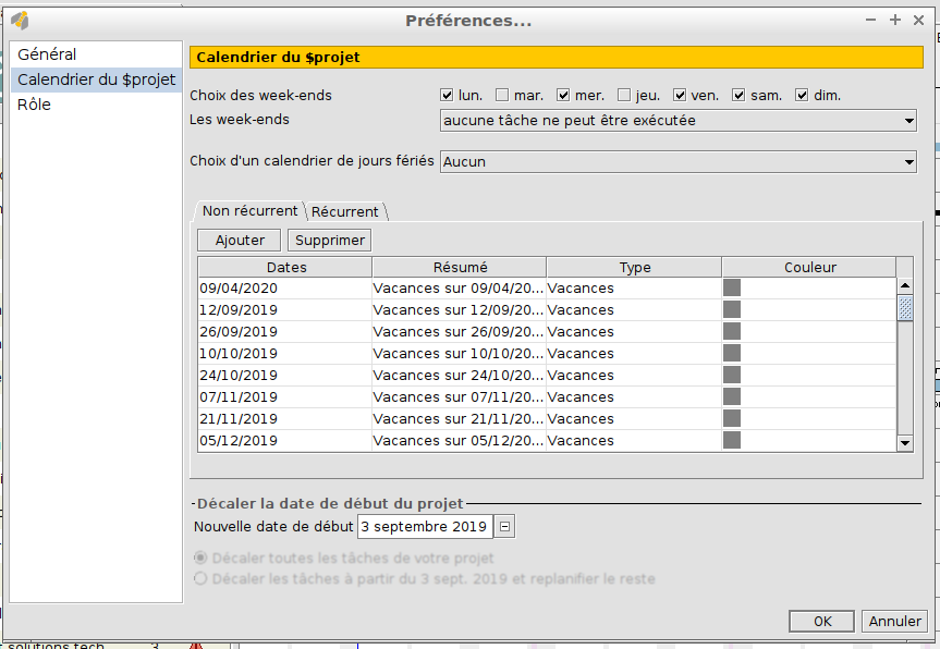 En haut à gauche cliquez sur "Projet" puis "Paramètres du projet" cliquez sur calendrier du $projet.
