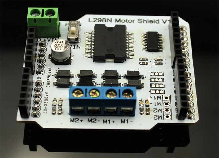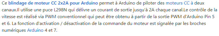 Cette carte est indispensable avec un projet robotique Arduino car la carte Arduino ne permet pas de piloter des moteurs CC.