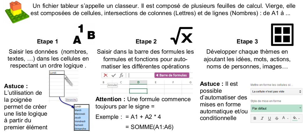 Un tableur-grapheur est un outil de traitement de l’information. Il permet de présenter des informations sous forme de tableaux et de graphiques. Il permet également d’automatiser un certain nombre d'opérations grâce aux « fonctions » (fonctions mathématiques, fusionner des listes de mots, incrémenter automatiquement dates, heures, chiffres, ...)