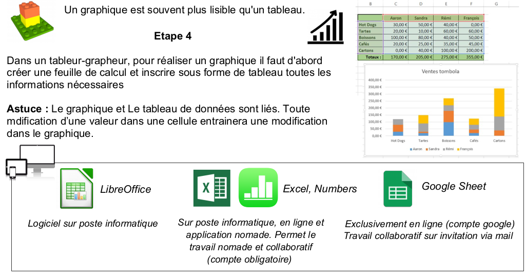 Un tableur-grapheur est un outil de traitement de l’information. Il permet de présenter des informations sous forme de tableaux et de graphiques. Il permet également d’automatiser un certain nombre d'opérations grâce aux « fonctions » (fonctions mathématiques, fusionner des listes de mots, incrémenter automatiquement dates, heures, chiffres, ...)